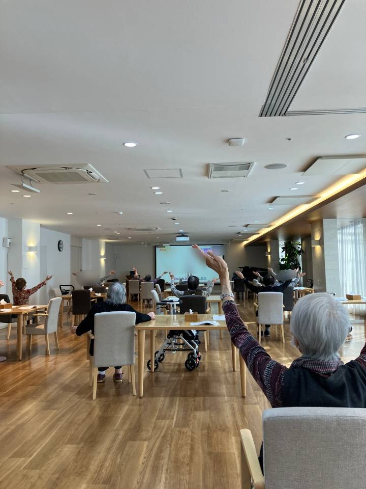 当ホームでは、毎日午前10時から30分間、グランドダイニングにて大型スクリーンに映像を映しながら朝の体操を行っています。