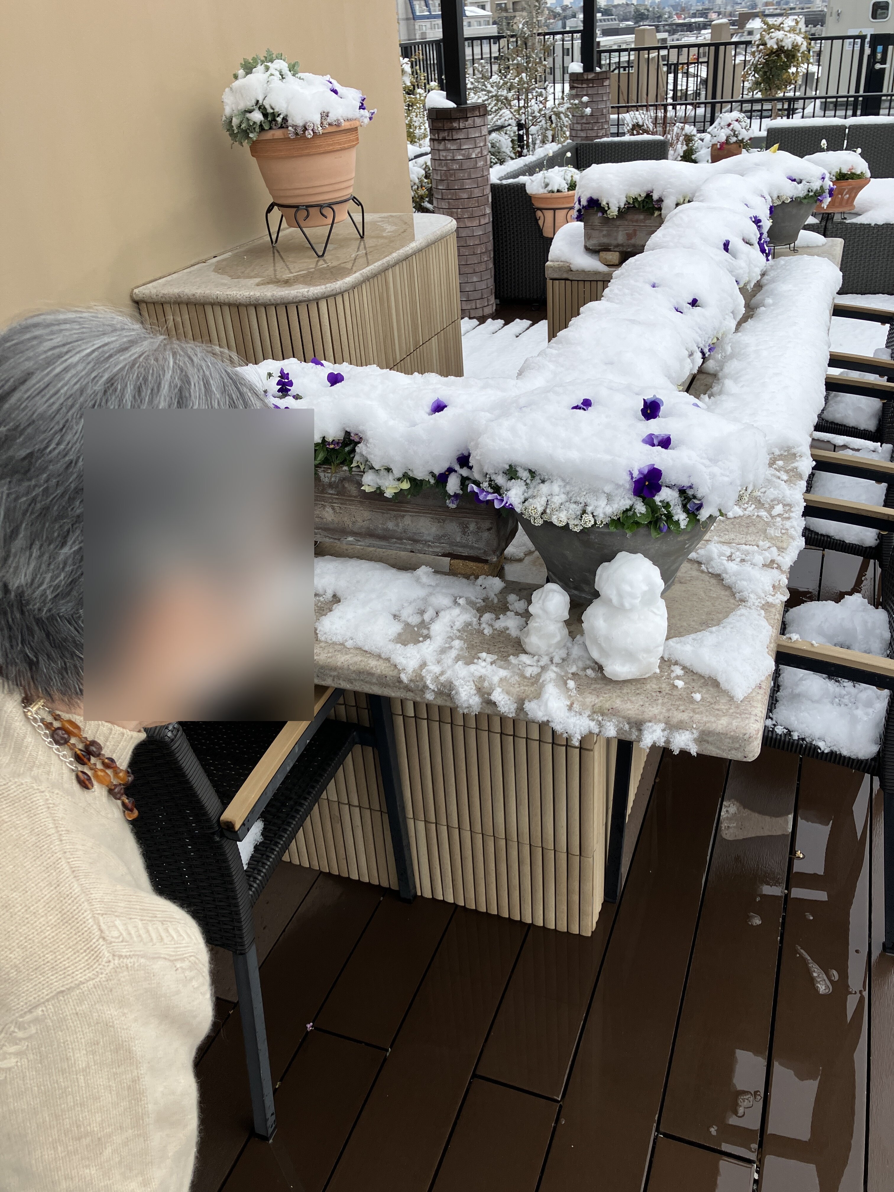 すっぽりと雪をかぶった屋上ガーデンテラスの様子をスタッフが撮影し、そのお写真を皆さまにお見せすると