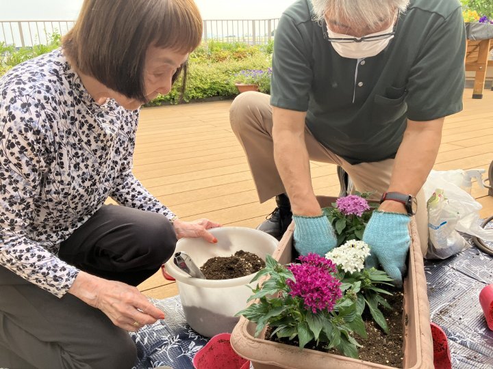 H様のお気持を拝聴したPAは、ライフマネージャーや園芸が得意なスタッフと相談し、屋上のプランターのお花を植え替えることに。