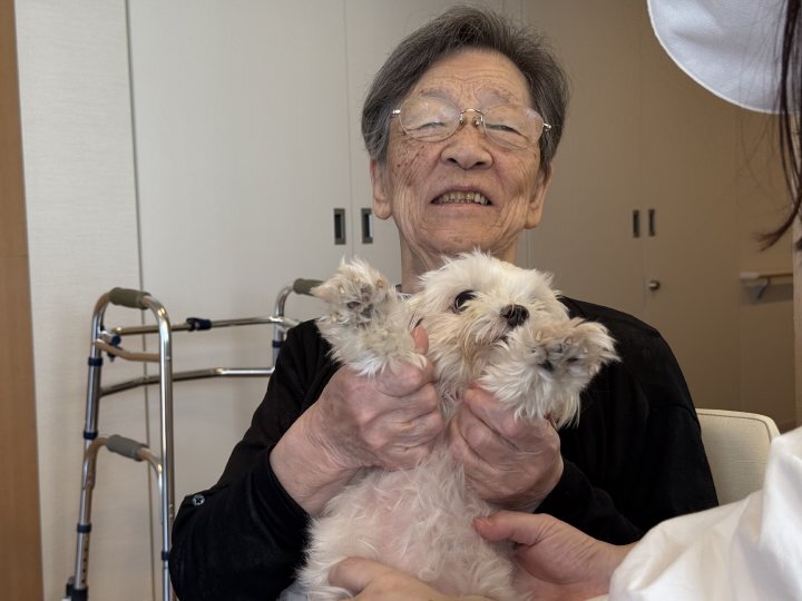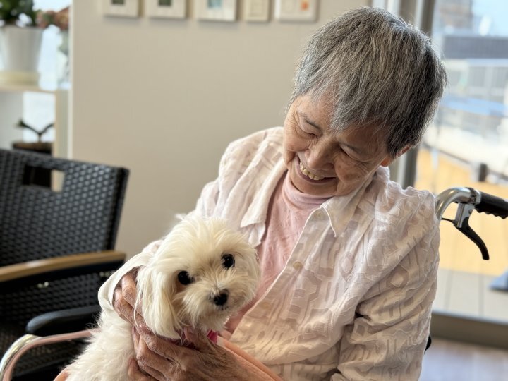 ご入居者から「本物のワンちゃんに触りたい」とのお声が多数あり、先月から新しく導入した『ドッグセラピー』。