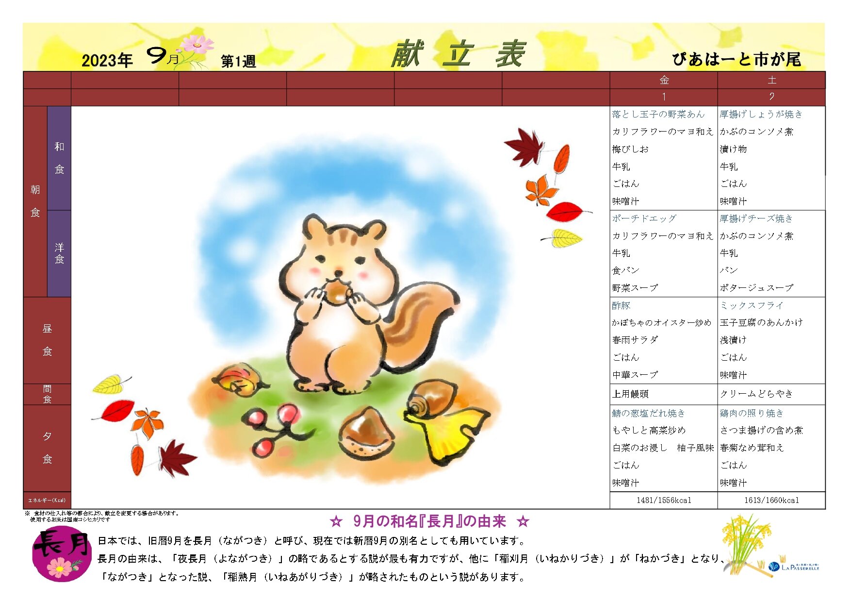 9月の行事予定表と献立表
