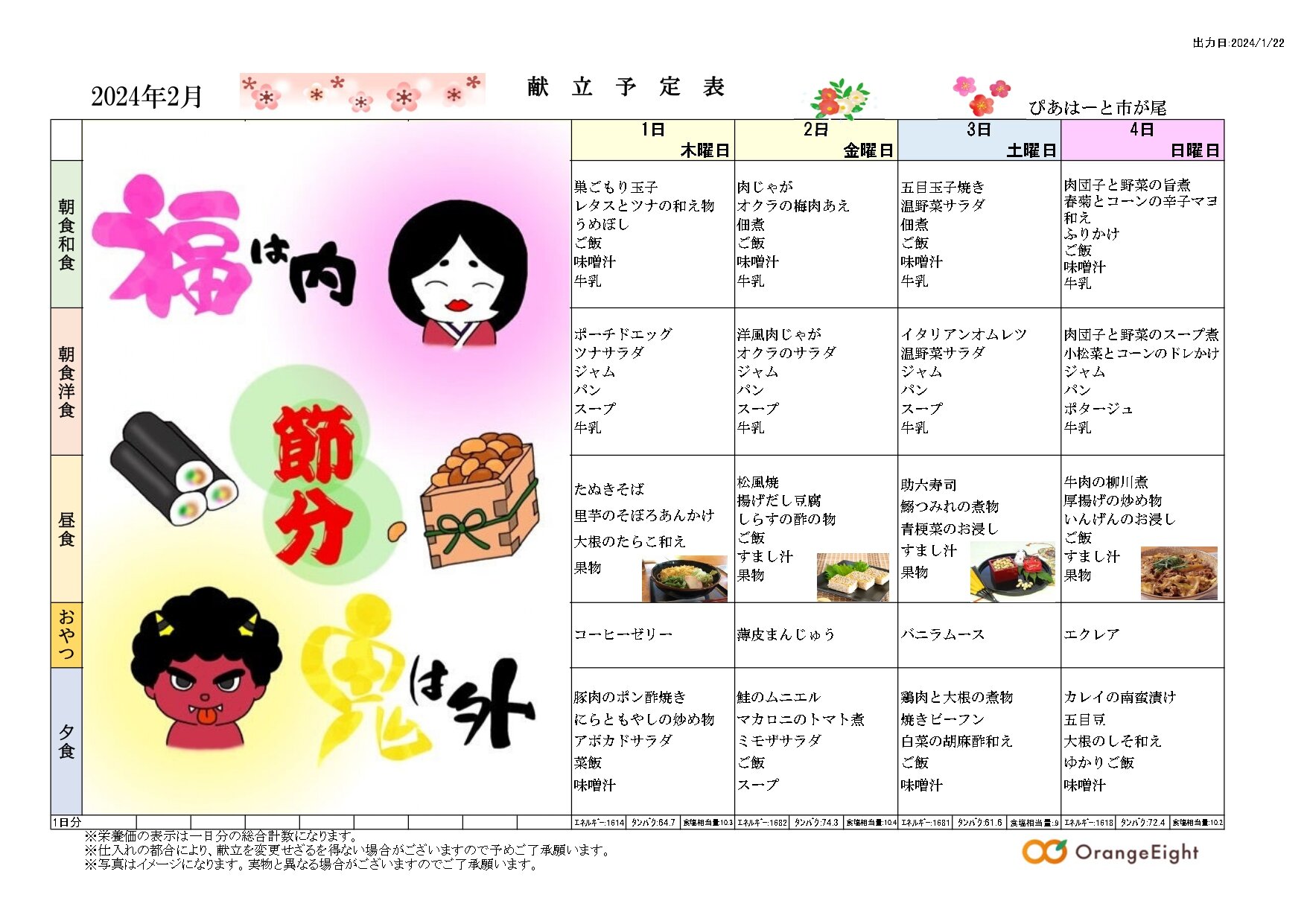 2月の行事予定表と献立表をご紹介いたします。