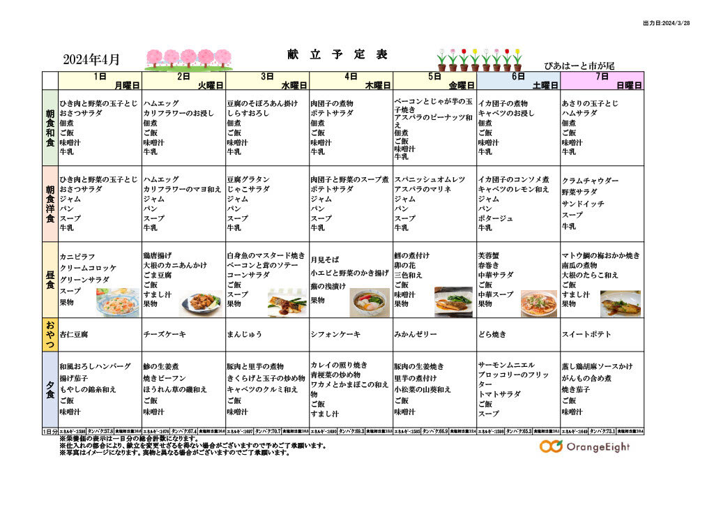 4月の行事予定表と献立表をご紹介いたします。