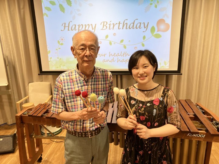 この日は、お誕生日の方やそのほかご希望者の方に、簡単な楽器で演奏にご参加いただき、マリンバとのセッションが実現。