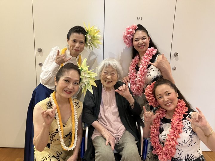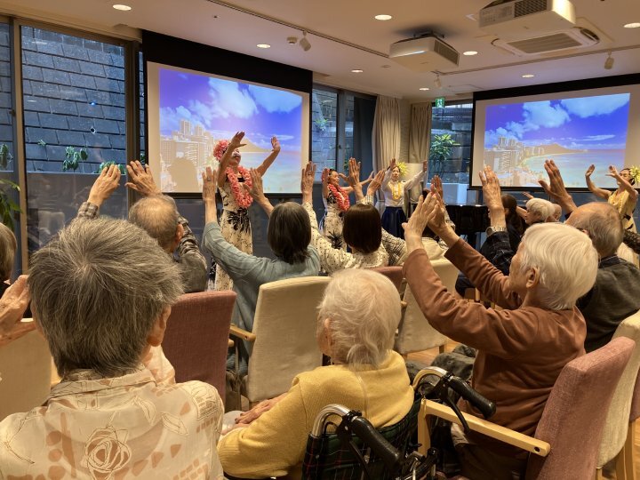 ダンサーの方が「Aloha!」と声をかけると、ご入居者も満面の笑みで「Aloha!」と返され、南国ならではの明るい一体感が生まれました。