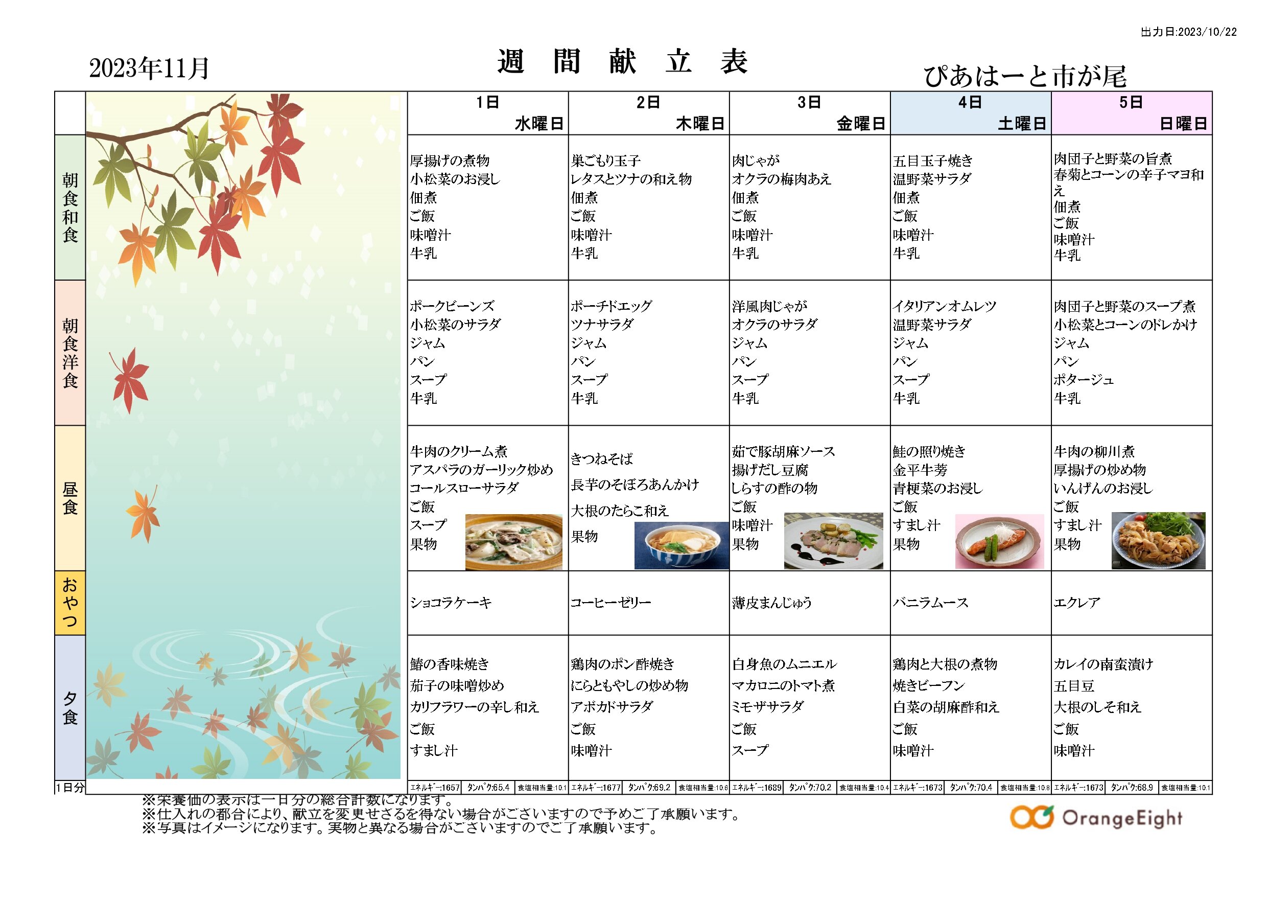 11月の行事予定表と献立表