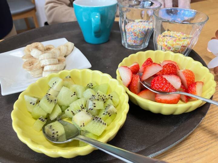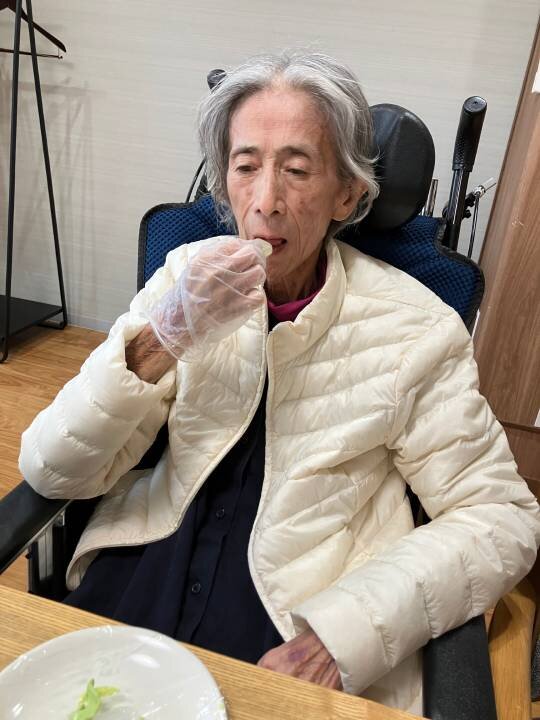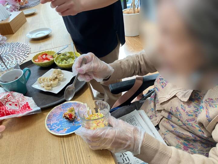 また、普段はお食事の場面でスタッフのサポートを受けることの多い方が、ご自身から手を伸ばして盛り付けをされたり、居室で過ごされる時間が長い方が車いすで参加され、表情豊かにお菓子づくりに取り組まれたりする場面もみられました。