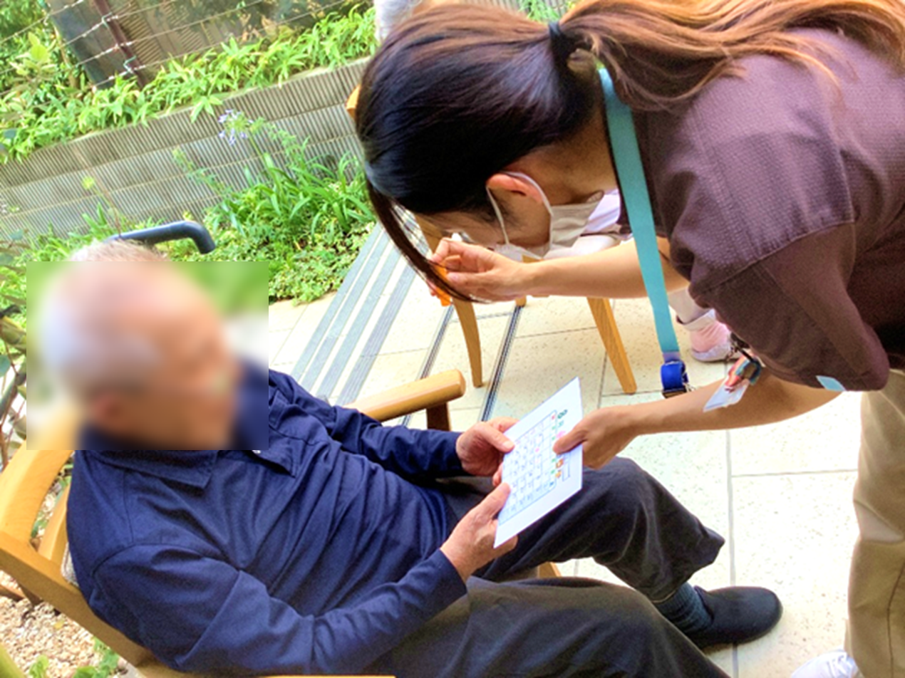 体操を終えた後は、ケアスタッフ手作りの「体操カード」にスタンプを押していきます。
