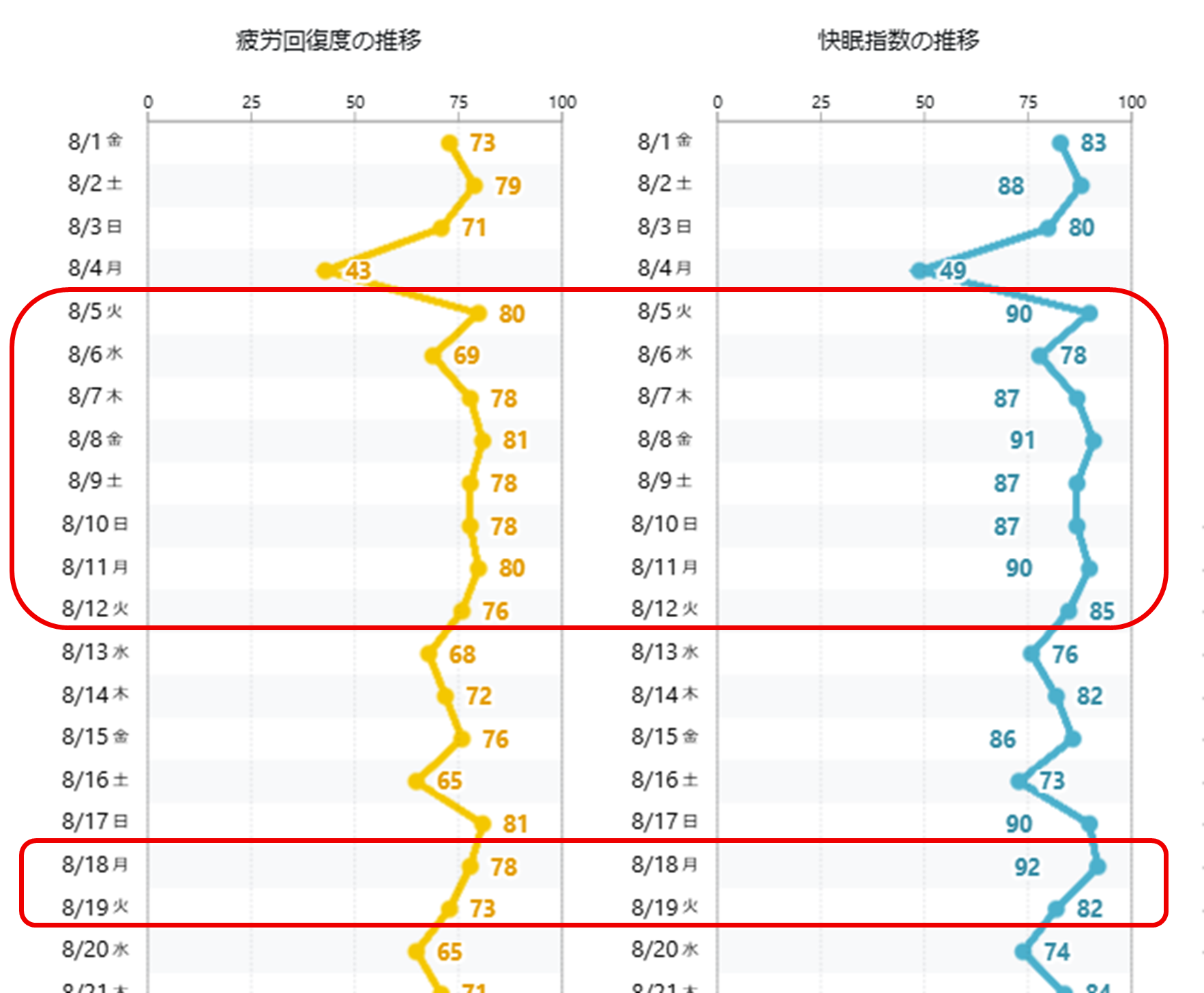 赤い枠で囲まれた部分が、ラジオ体操に参加された日の夜の数値です。