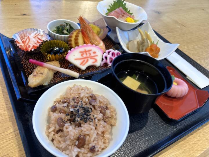 お赤飯と清まし汁を合わせ、新しい一年の始まりにふさわしい献立に仕上げています。