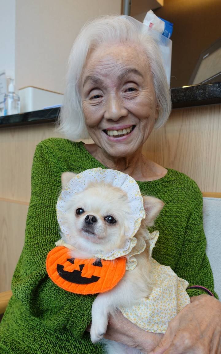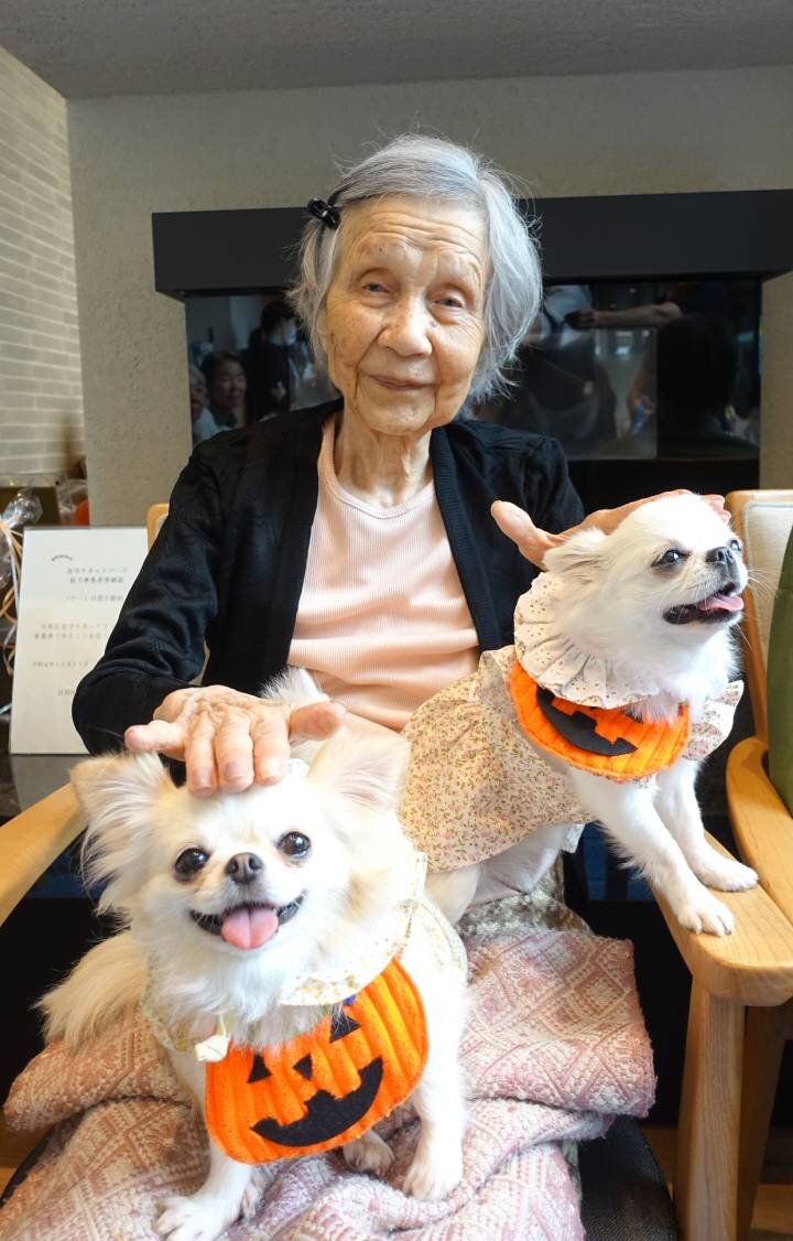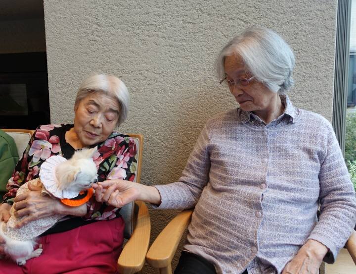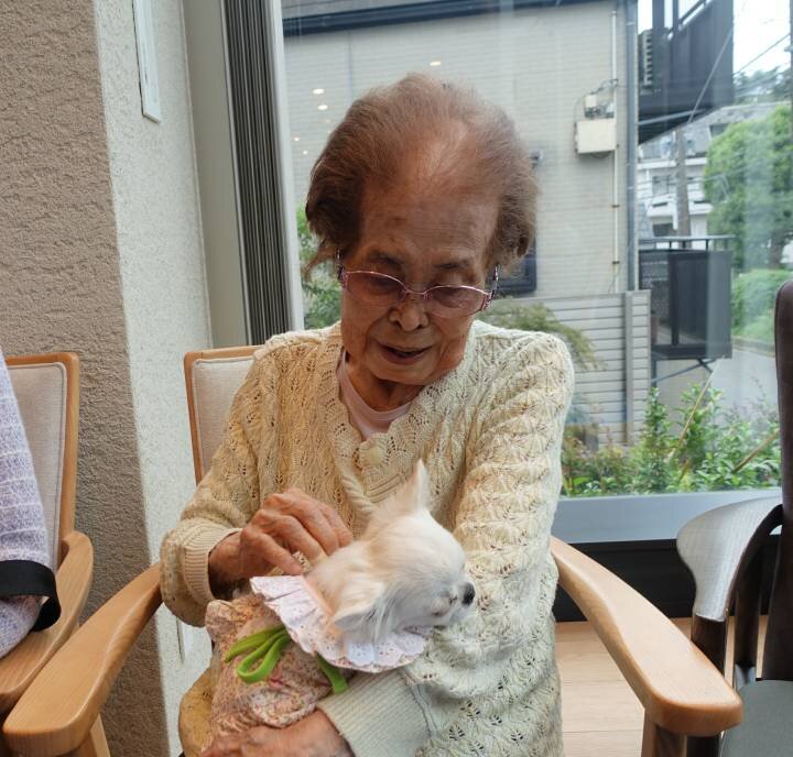 優しく語り掛けながら膝の上でワンちゃんを抱くご入居者の表情は、どなたも柔らかく穏やか。