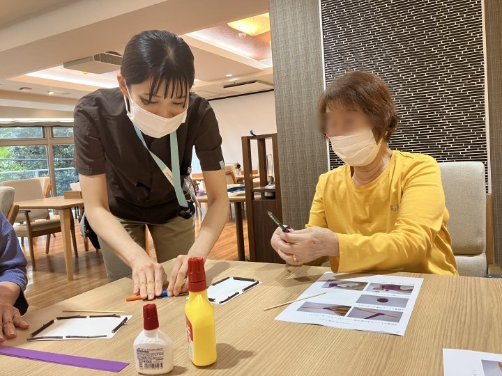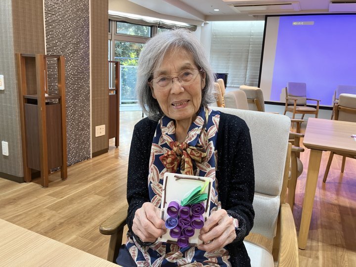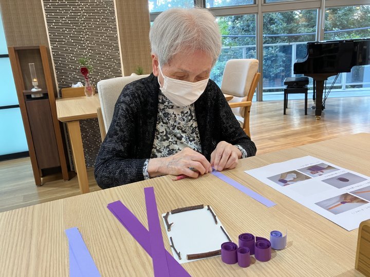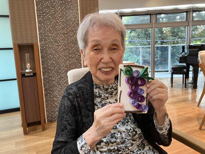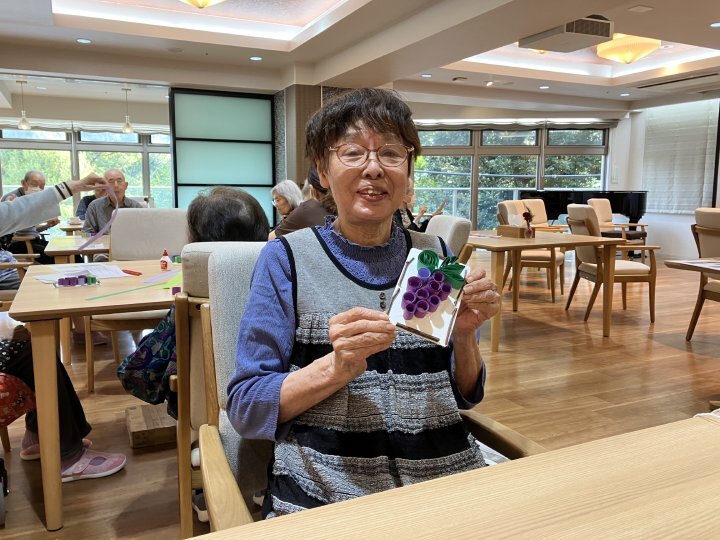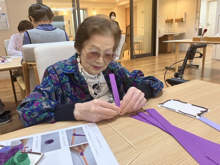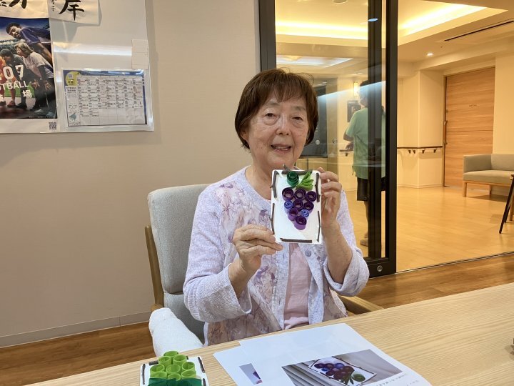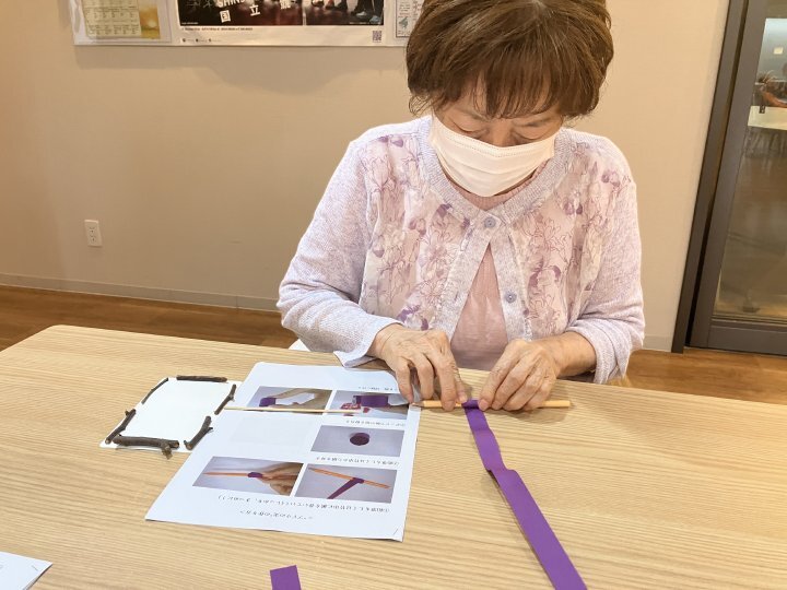 第5弾となるOT主催による手芸アクティビティでは、細長い紙をくるくると巻いて形を作る「ペーパークイリング」で、ぶどうの作品作りに挑戦しました。