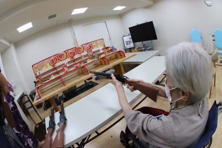 木製の射的銃を手に狙いを定める姿は真剣そのものです。