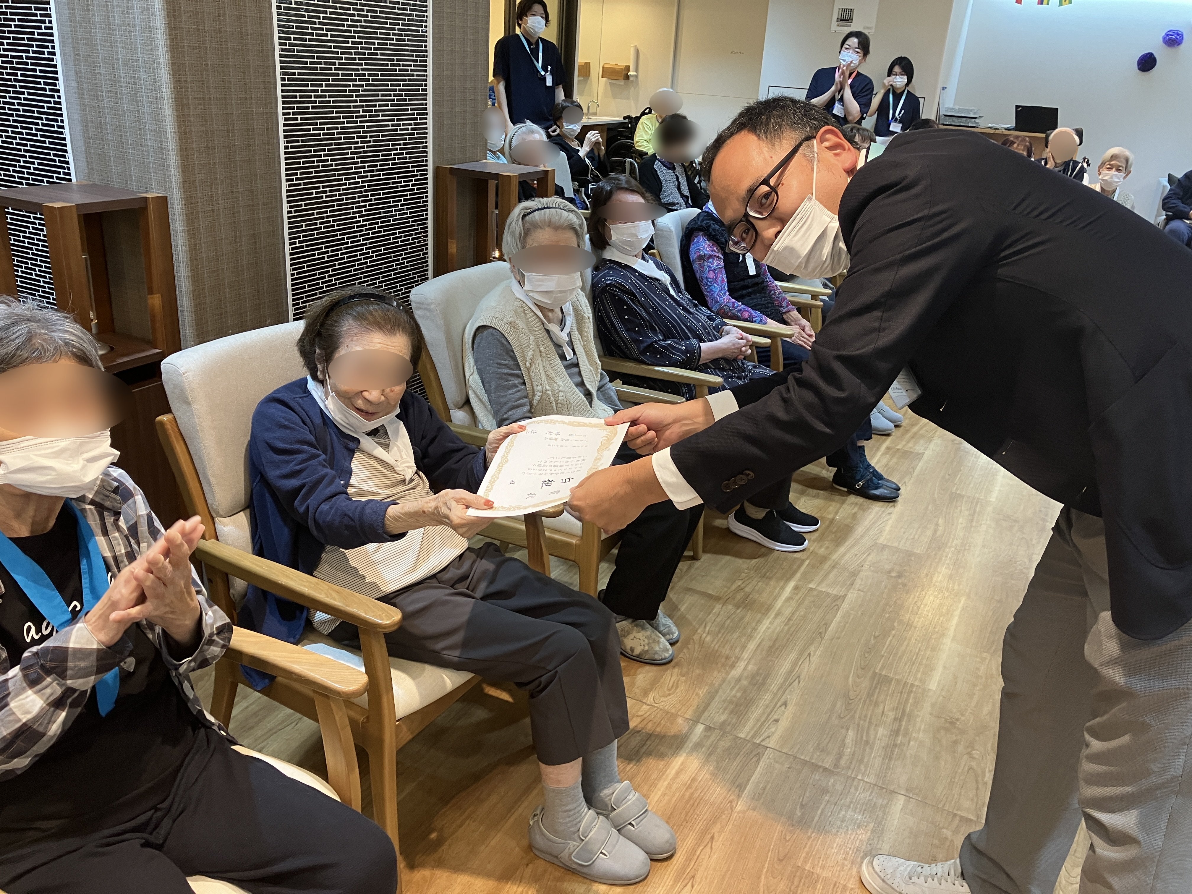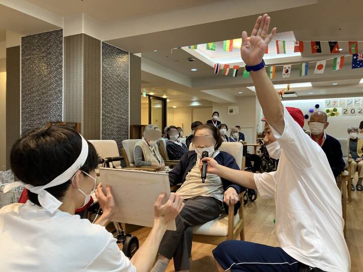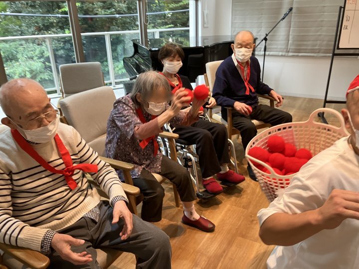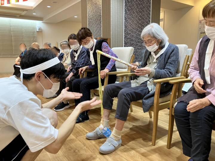 ご入居者の皆さまは紅組・白組に分かれ、まずはラジオ体操からスタートです!