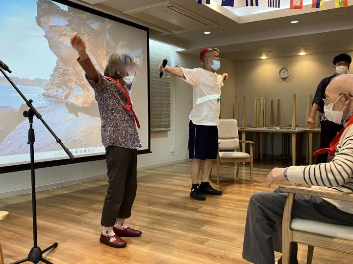 「ラジオ体操なんて久しぶりだね!」「もう忘れちゃったわよ…」とおっしゃる方も、音楽が流れ始めると皆さま自然と身体が動き出し、軽やかな動きでしっかりと身体をほぐされていました。