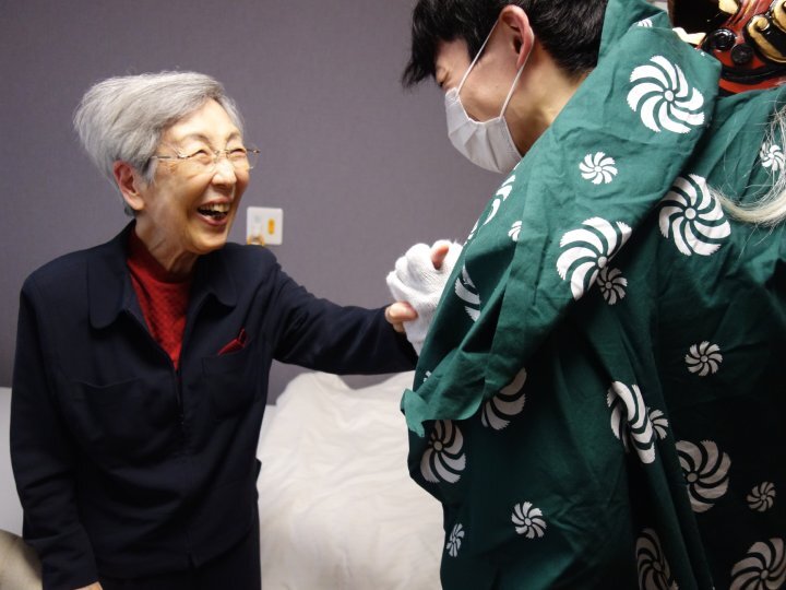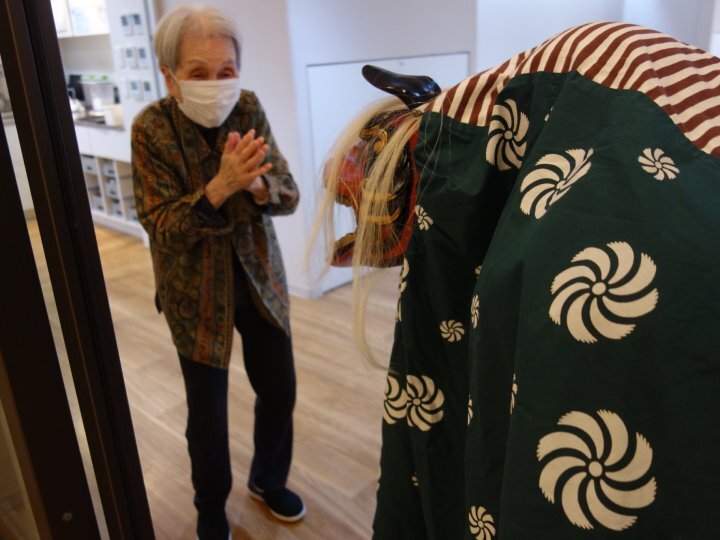獅子舞は、ダイニングの皆さまへのご挨拶を済ませると、今度はお部屋でお過ごしの皆さまのもとへと伺いました。