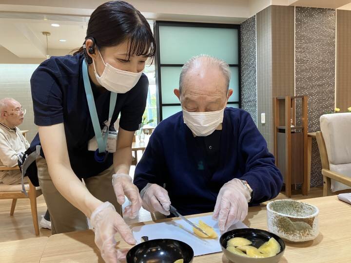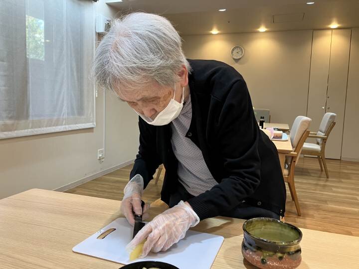 包丁を握る、器に盛りつけるといった馴染みのある動作に加え、新しいことに挑戦する機会にもなる調理アクティビティ。