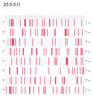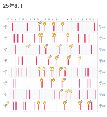 グラフの中心が深夜0時、赤の縦ラインがトイレの回数を示しています。