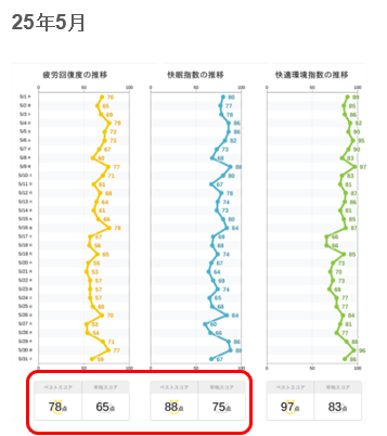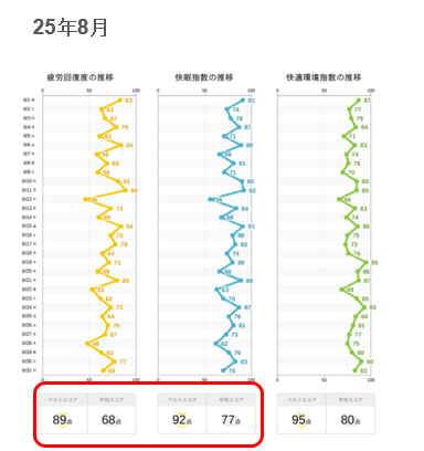 こちらは、左から「疲労回復度」(黄色)、「快眠指数」(水色)、「快適環境指数」(黄緑)の推移です。