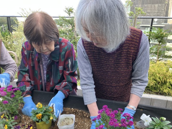 秋の柔らかな日差しが差し込むこの日、ホーム5階の屋上ガーデンテラスで園芸を行ないました。