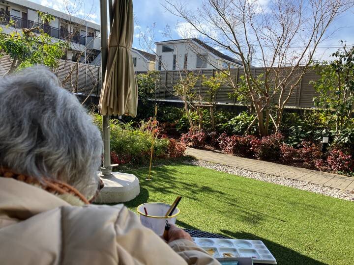 そこでこの日は、O様の想いをかたちにする場として、ホーム自慢の中庭でスケッチを行っていただくこととしました。