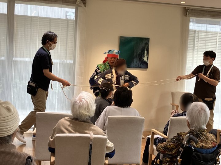 紙や紐を使った手品が次々と披露され、なかでも三本の紐の長さが揃うマジックには、皆さま何度も紐を確かめながら不思議そうなご様子。