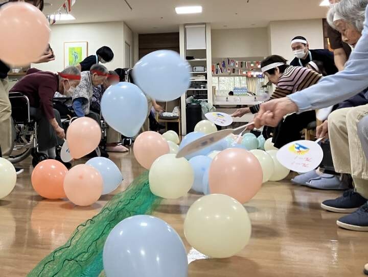 勢いよく舞い上がる風船は動きが読みにくいものの、皆さまは巧みな手さばきで次々と相手側へ!