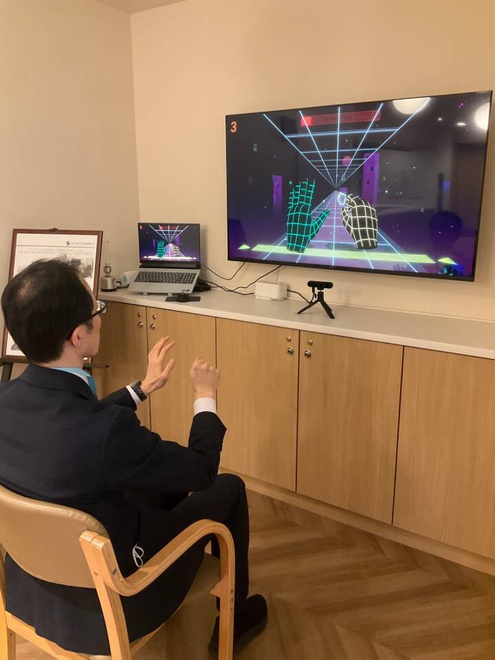 音楽のリズムに合わせて、画面に映し出される手の形や高さをまねていくゲームです。