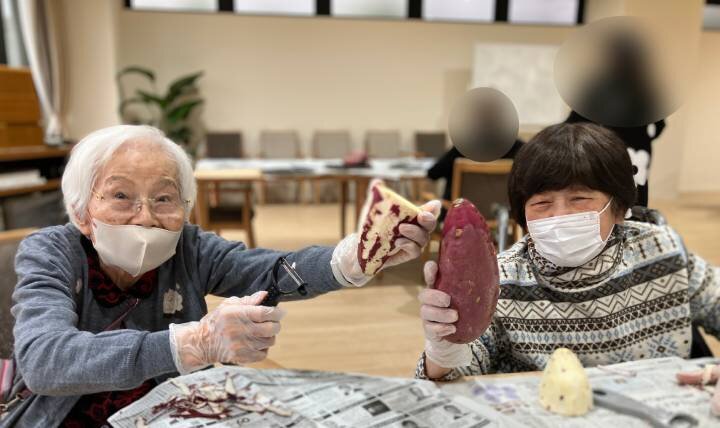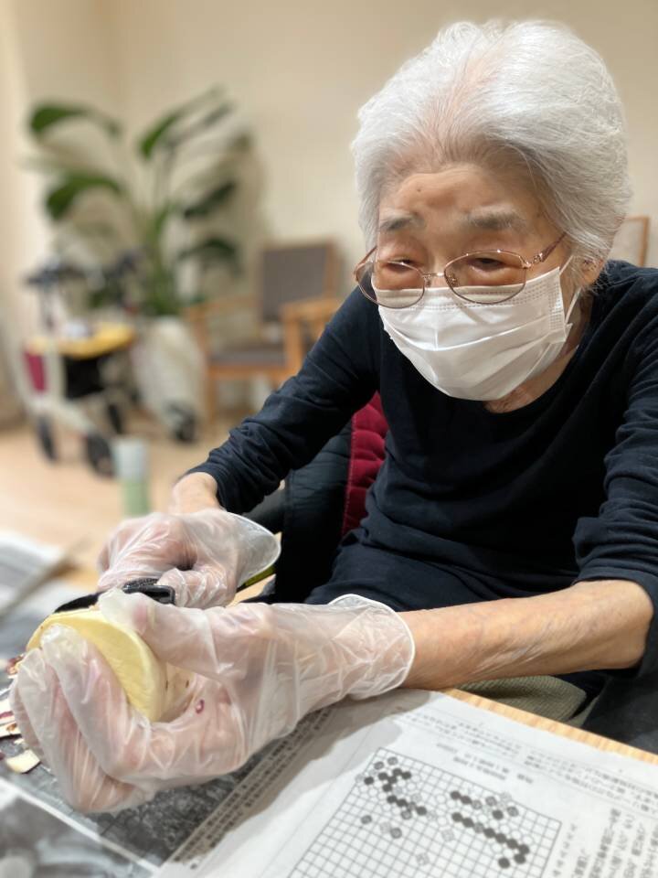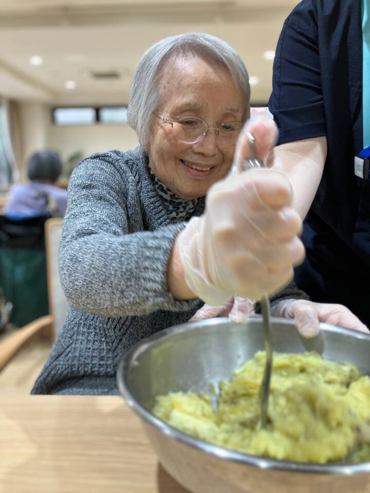 皮むきからつぶす作業、甘味づけまで、ご入居者とスタッフが協力し合って進めました。