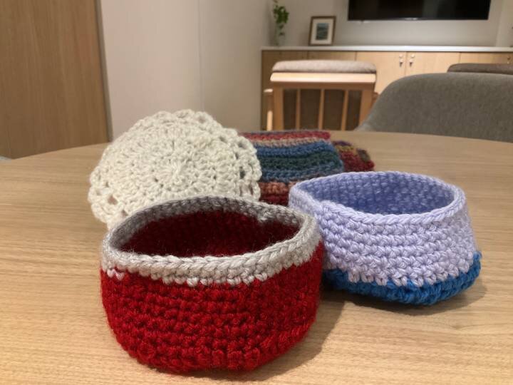 この日は、かぎ針で編む丸い小物入れ作りに挑戦しました。
