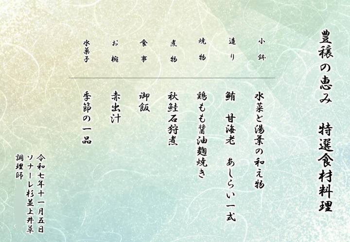 秋の実りを存分に味わっていただけるよう、旬の食材をふんだんに採り入れた献立をご用意いたしました。