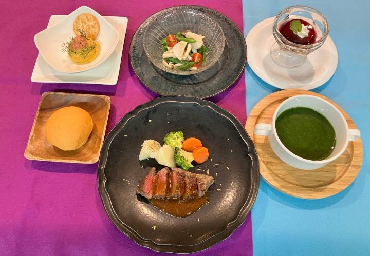 前菜には早秋を感じさせるかぼちゃとスモークサーモンのムース、滋味豊かなモロヘイヤのポタージュなど、彩りも味わいも華やかな献立に仕立てました。