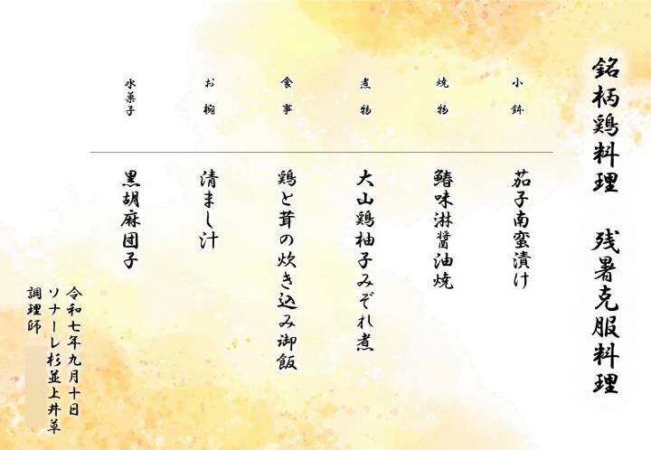 夏の疲れが出やすいこの時期に、今月のブランドメニュー第2弾として『銘柄鶏料理 残暑克服料理』をご用意いたしました。