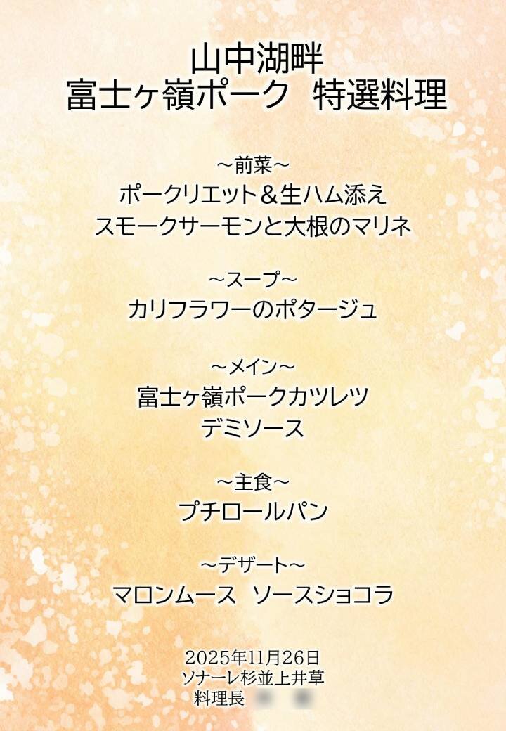 今回のブランドメニューは『山中湖畔 富士ヶ嶺ポーク特選料理』です。