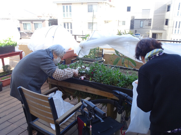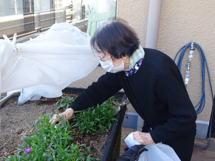 2階のテラスに並ぶ鉢やプランターに、数名のご入居者とともに種や苗を植え、育てていく中で、M様とO様にもお力をお借りしています。